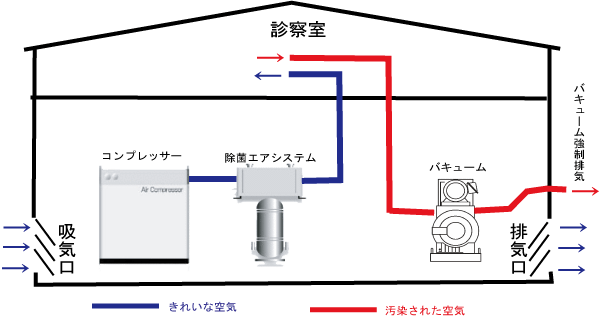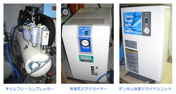 歯科治療時には非常に多くの圧縮空気を使用します。また、水や汚物を吸い取る吸引も使用します。