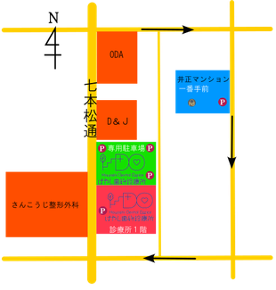 当院の目の前の七本松通から2本東の裏路地にある「井正マンション」駐車場➡Googleマップ に、当院の看板が貼ってある契約駐車場が1台分有ります。