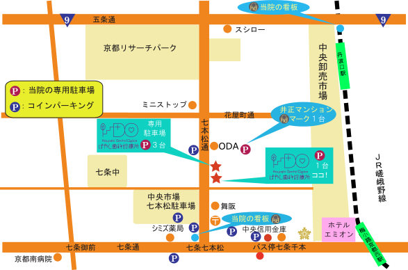 ・「七条千本」➡から 北西へ徒歩4分 ・「京都リサーチパーク前」➡から 南西へ徒歩8分 |