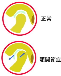 正常な顎関節では下顎頭が関節窩の中心に位置しているのに対して、顎関節症の顎関節では下顎頭が関節窩の後方に位置しています。