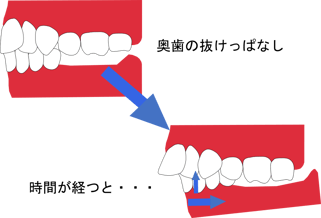 奥歯がずっと抜けっぱなしになると噛み合わせの高さが減り、上の前歯が前方に飛び出すように傾斜し、下顎は後ろに下がってしまいます。
