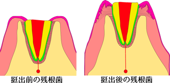 一方、残根歯を挺出させることで歯冠と歯根の比率の改善が出来、歯冠の立ち上がりも適正で理想的な噛み合わせの面を作ることが出来ます。さらに歯根膜の力で失われた歯を支えている歯肉や骨も再生することが出来ます。