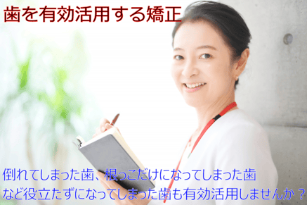 傾斜したままの歯は、汚れが溜まりやすく歯に無理な力もかかってしまうため、虫歯や歯周病などにとてもなりやすいです。また失った歯を補うための支えとして使う場合も、傾斜したままでは用途も限られ長持ちしません。そこで傾斜した歯をまっすぐにすると、その歯が長持ちするだけでなく失った歯を補う治療の幅も広げることができます。