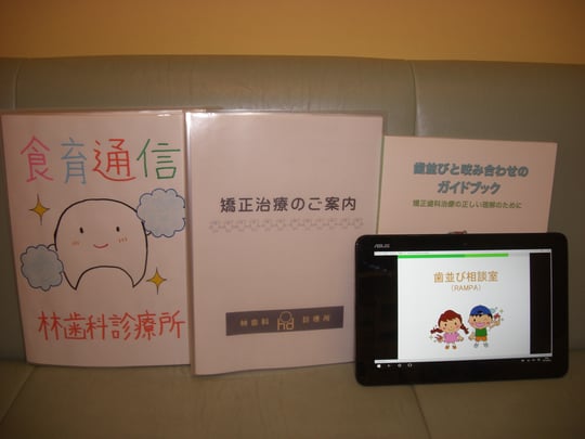 矯正治療に関する事をまとめた冊子と症例集をタブレットで見れるように