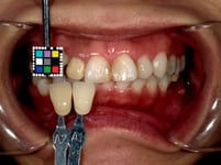 セラミックなどの歯を製作する場合、周囲の歯と色調を合わせるために歯の色を見せて頂く事をシェードテイキングと呼んでおります。