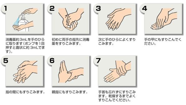 アルコール消毒はしっかりとすりこむ事が大切です!